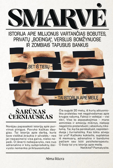 Knygos puslapiuose nugulė aibė tikrų istorijų – nuo bankų plėšikais tapusių bankininkų ir Kremliaus elitui išplautų milijardų iki balsų supirkinėjimo Seimo rinkimuose ar verslo, sukurto vagiliaujant iš labdaros konteinerių. Suskaičiuota tiek pinigų, kiek pakaktų nedidelės valstybės biudžetui. Ir visi tie pinigai skleidžia specifinį kvapą. Smarvę.