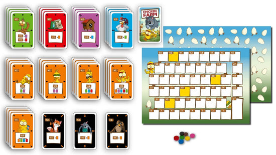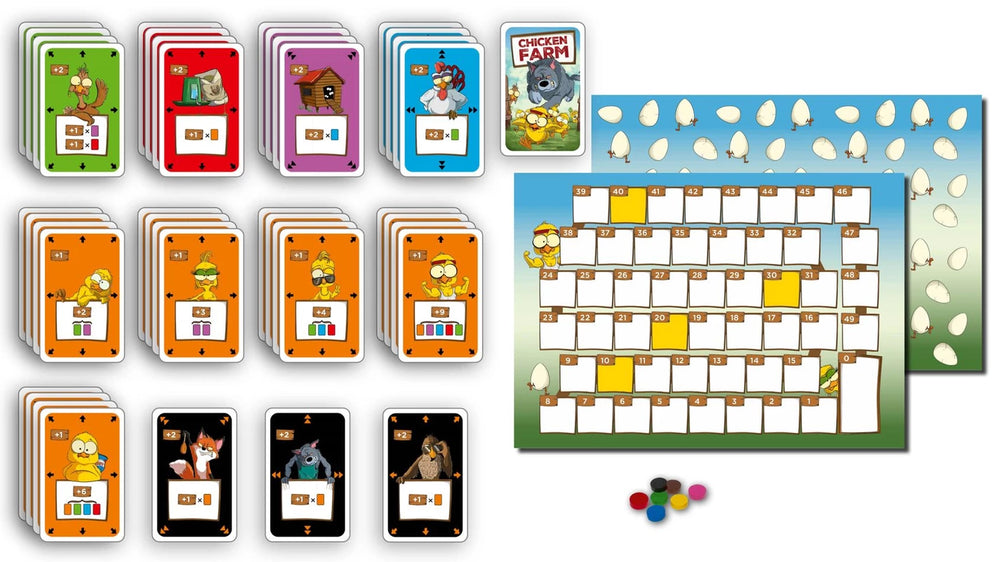 ŽAIDIMĄ „Chicken farm“ SUDARO: žaidimo lenta, 72 kortos, 7 taškų žymekliai, taškų skaičiavimo lenta, taisyklių knygelė. Žaidimas skirtas 2-7 žaidėjams. Žaidėjų amžius – nuo 10 metų. Žaidimo trukmė – 30 min.