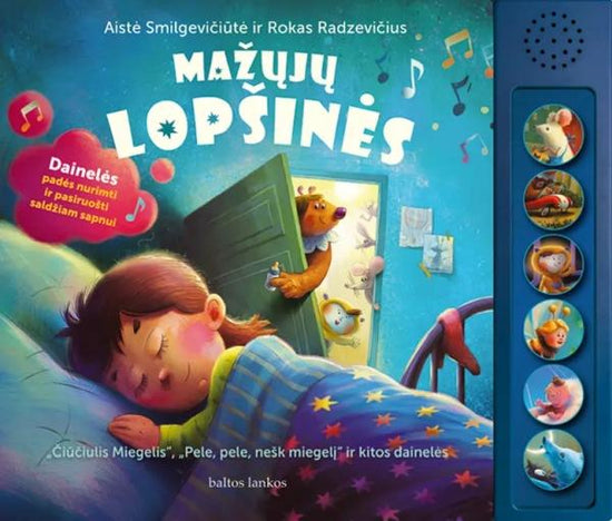 Šioje knygoje „Mažųjų lopšinės. „Čiūčiulis miegelis“, „Pele, pele, nešk miegelį“ ir kitos dainelės“ rasite šešias įgarsintas lietuviškas lopšines: